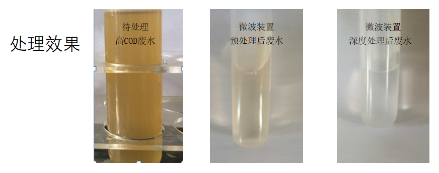 废水经过预处理、二级微波催化氧化处理后,成为无色、无味液体,COD降到50mg/L以下。