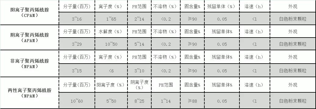 PAM的平均分子量从数千到数千万以上,沿键状分子有若干官能基团,在水中可大部分电离,属于高分子电解质。根据它可离解基团的特性分为阴离子型聚丙烯酰胺、阳离子型聚丙烯酰胺、和非离子型聚丙烯酰胺。